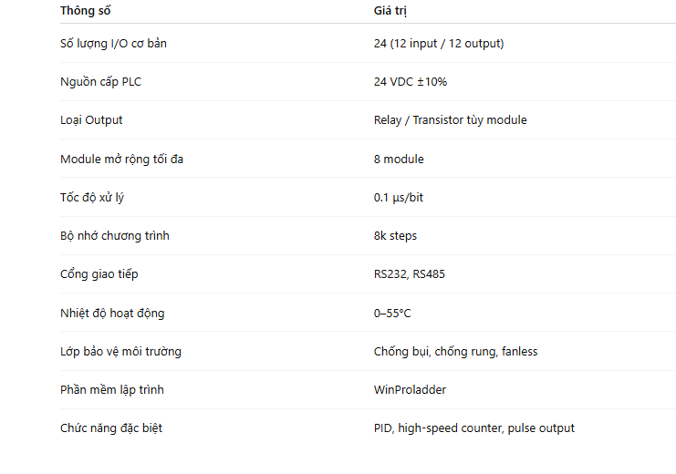 Ngoài ra, PLC còn hỗ trợ chức năng PID tích hợp, giúp điều khiển nhiệt độ, áp suất, lưu lượng hoặc tốc độ động cơ một cách chính xác. Kết hợp với high-speed counter và pulse output, FBs-24YT giúp kiểm soát quá trình sản xuất liên tục và ổn định, đảm bảo chất lượng sản phẩm và nâng cao hiệu suất vận hành.