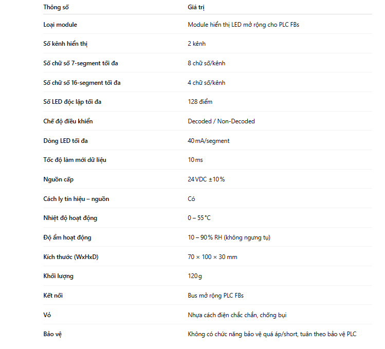 Với thiết kế bền bỉ, cách ly nguồn – tín hiệu, FBs‑7SG2 hoạt động ổn định trong môi trường công nghiệp khắc nghiệt, chịu dao động điện áp, nhiễu điện từ và nhiệt độ cao. Module không chỉ tiết kiệm chi phí đầu tư so với HMI mà còn tối ưu không gian tủ điện, đơn giản hóa lắp đặt, bảo trì và mở rộng hệ thống hiển thị một cách linh hoạt.