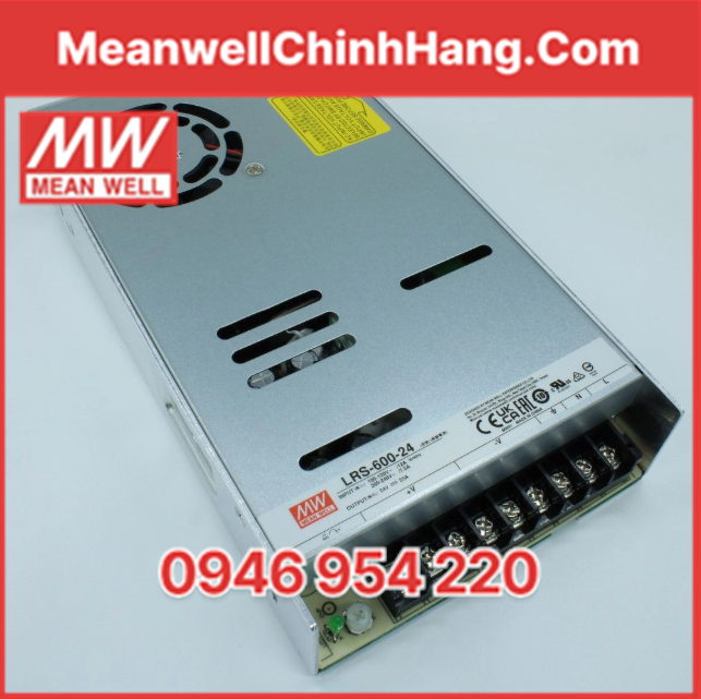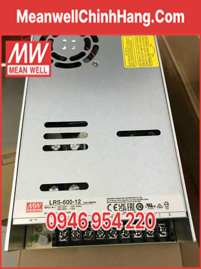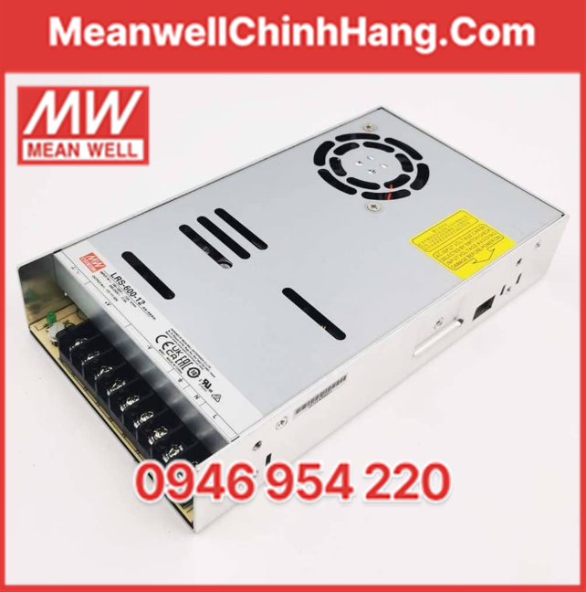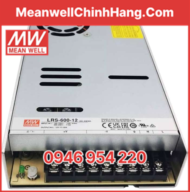 Mean Well LRS-600-12 – bộ nguồn AC/DC 12VDC 600W, dòng ra 50A, hiệu suất 90%, thiết kế vỏ kim loại kín, bảo vệ toàn diện, vận hành bền bỉ trong môi trường công nghiệp.
