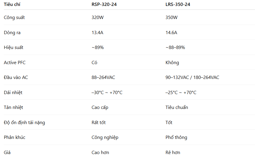 RSP-320-24, dù công suất danh định thấp hơn, nhưng nhờ thiết kế mạch tinh vi, tản nhiệt tốt và PFC chủ động, lại chịu tải nặng, nóng, liên tục tốt hơn. Ngược lại, LRS-350-24, dù có 350W, không ổn định bằng RSP nếu dùng trong môi trường công nghiệp hoặc tải thay đổi liên tục.