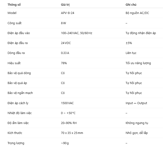 APV-8-24 là bộ nguồn AC/DC công suất 8 W, chuyển đổi điện áp từ 100–240 VAC sang 24 VDC ổn định, được thiết kế dành cho các thiết bị điện tử nhỏ, module điều khiển, cảm biến, LED chiếu sáng, quạt mini, van điện từ và các hệ thống tự động hóa. Sản phẩm thuộc dòng APV Switching Type, nổi bật với thiết kế cách ly đầu vào – đầu ra hoàn toàn, đảm bảo an toàn cho mạch điều khiển và tải, bảo vệ hệ thống khỏi dao động điện áp, nhiễu hoặc quá tải.