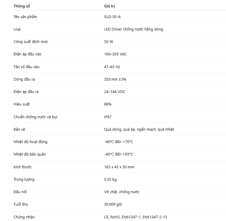 Với thiết kế này, XLG-50-A không chỉ mang đến ánh sáng ổn định, chất lượng cao, mà còn tiết kiệm năng lượng, giảm chi phí vận hành và tăng tuổi thọ cho hệ thống LED, biến sản phẩm trở thành lựa chọn lý tưởng cho mọi công trình chuyên nghiệp và các dự án đòi hỏi tính ổn định, bền bỉ và hiệu quả lâu dài.