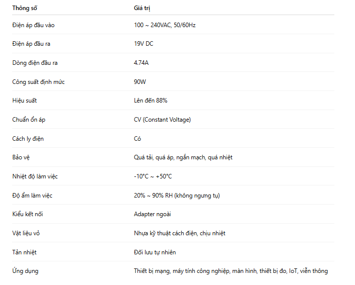 Trong các hệ thống điện tử và tự động hóa ngày nay, chất lượng nguồn cấp là yếu tố quyết định trực tiếp đến độ ổn định và tuổi thọ thiết bị. GSM90A19-P1M được thiết kế như một bộ adapter nguồn công nghiệp 19V – 90W, đáp ứng yêu cầu vận hành liên tục, ổn định và an toàn cho nhiều loại thiết bị điện tử từ dân dụng cao cấp đến công nghiệp chuyên dụng.