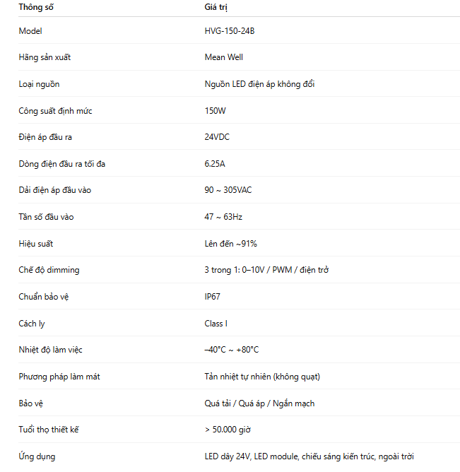 HVG-150-24B là bộ nguồn LED điện áp không đổi 24V, công suất 150W, được thiết kế chuyên biệt cho các hệ thống chiếu sáng LED yêu cầu độ ổn định cao, vận hành liên tục và khả năng điều chỉnh độ sáng linh hoạt. Đây là dòng nguồn phù hợp cho các công trình chiếu sáng ngoài trời, kiến trúc, bảng hiệu và hệ thống LED công nghiệp, nơi bộ nguồn không chỉ cần đủ công suất mà còn phải chạy bền, ít sự cố và dễ kiểm soát ánh sáng.