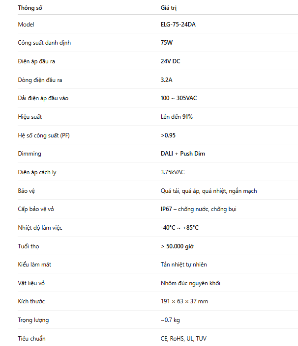 Với thiết kế công nghiệp bền bỉ, nền tảng linh kiện chất lượng cao và khả năng vận hành ổn định lâu dài, ELG-75-24DA không chỉ đơn thuần là một bộ nguồn LED 24V–75W, mà thực sự là trụ cột năng lượng của toàn bộ hệ thống chiếu sáng.