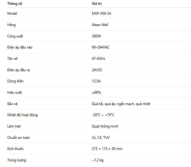 Sự kết hợp giữa kết cấu cơ khí chắc chắn – mạch điện chuẩn công nghiệp – hệ thống làm mát thông minh giúp MSP-300-24 đáp ứng tốt các yêu cầu khắt khe của môi trường nhà máy, tủ điện công nghiệp và các hệ thống tự động hóa hiện đại.