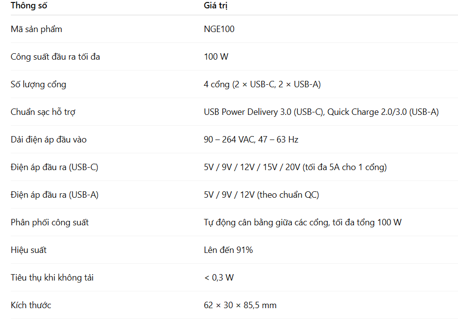 Với công nghệ GaN tiên tiến, hiệu suất sạc lên tới 100W, thiết kế nhỏ gọn, khả năng sạc đa thiết bị, cùng độ tin cậy đạt chuẩn công nghiệp, sản phẩm này hoàn toàn xứng đáng trở thành lựa chọn hàng đầu cho mọi nhu cầu sạc nhanh – an toàn – bền bỉ.