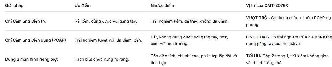 CMT-2078X là màn hình công nghiệp 7-inch với độ phân giải 1024 x 600 (WSVGA), sử dụng màn hình TFT LCD với độ sáng cao 1000 nits. Điểm đột phá nằm ở việc tích hợp đồng thời hai công nghệ cảm ứng trên một màn hình:
