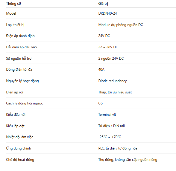 DRDN40-24 là module dự phòng nguồn DC chuyên dùng cho các hệ thống 24V DC, cho phép hai bộ nguồn hoạt động song song độc lập nhằm đảm bảo hệ thống không bị gián đoạn điện áp khi một nguồn gặp sự cố. Đây là giải pháp bắt buộc trong các ứng dụng công nghiệp yêu cầu độ tin cậy cao, nơi việc mất nguồn dù chỉ vài mili giây cũng có thể gây dừng máy, lỗi PLC hoặc mất dữ liệu.