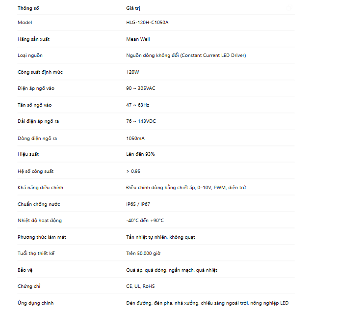 Nhờ hệ thống bảo vệ toàn diện và tự động như vậy, HLG-120H-C1050A mang lại sự an tâm tuyệt đối cho người sử dụng, đặc biệt trong các dự án chiếu sáng công suất lớn, vận hành liên tục và yêu cầu độ tin cậy cao, nơi mà mọi sự cố điện đều có thể gây tổn thất lớn về kinh tế và an toàn.