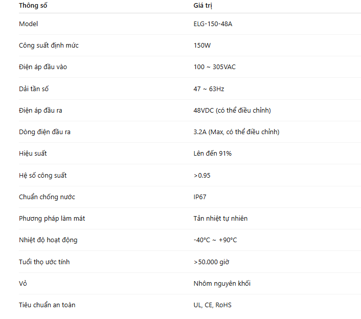 Với công suất 150W, chuẩn chống nước IP67, hiệu suất cao và hệ thống bảo vệ toàn diện, ELG-150-48A hiện đang là lựa chọn hàng đầu cho các dự án chiếu sáng và hệ thống điện ngoài trời chuyên nghiệp.
