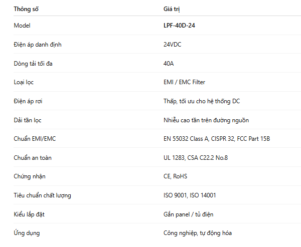 LPF-40D-24 đáp ứng đầy đủ các tiêu chuẩn quốc tế về nhiễu điện từ (EMI/EMC), an toàn điện và quản lý chất lượng, đảm bảo khả năng vận hành ổn định và tuân thủ yêu cầu kỹ thuật trong các hệ thống chiếu sáng chuyên nghiệp.