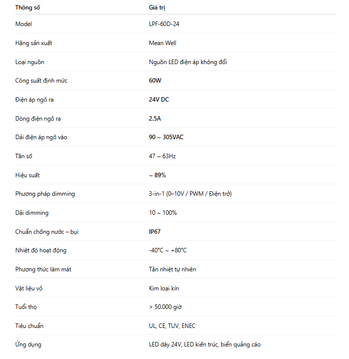 Với thiết kế kín hoàn toàn đạt chuẩn IP67, cùng khả năng dimming 3-in-1, LPF-60D-24 đáp ứng tốt nhu cầu của các dự án chiếu sáng kiến trúc, biển quảng cáo, LED trang trí và các hệ thống chiếu sáng điều khiển hiện đại.