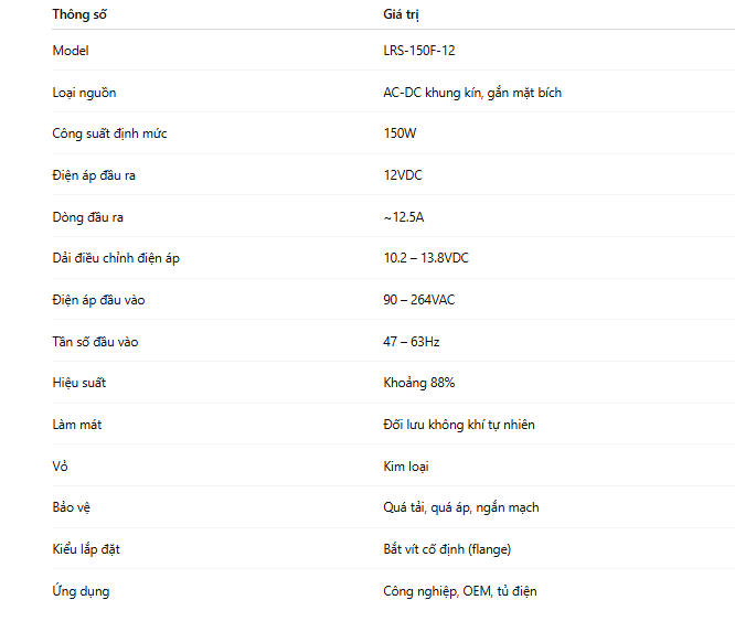 Tổng thể, LRS-150F-12 là giải pháp nguồn phù hợp cho các hệ thống cần nguồn 12V công suất trung bình, độ ổn định cao và lắp đặt chắc chắn. Sản phẩm đáp ứng tốt cả về kỹ thuật, độ bền và độ tin cậy, là lựa chọn đáng cân nhắc cho các ứng dụng công nghiệp và máy móc vận hành lâu dài.