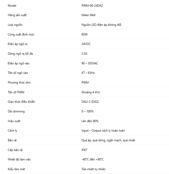 PWM-60-24DA2 là bộ nguồn LED điện áp không đổi 24VDC thuộc dòng PWM cao cấp của Mean Well, được thiết kế chuyên biệt cho các hệ thống chiếu sáng thông minh sử dụng giao thức DALI-2. Sản phẩm kết hợp giữa độ ổn định của nguồn công nghiệp và khả năng điều khiển ánh sáng chính xác, đáp ứng tốt các yêu cầu khắt khe trong chiếu sáng kiến trúc, chiếu sáng cảnh quan và hệ thống LED điều khiển tập trung.