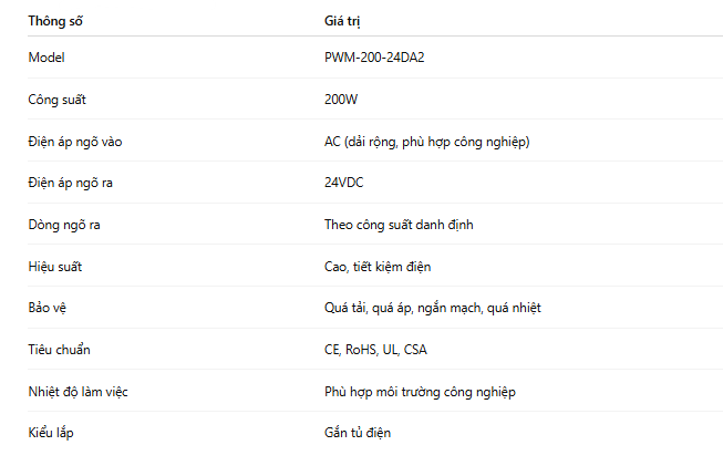 PWM-200-24DA2 là lựa chọn đáng tin cậy và thực dụng cho các hệ thống cần nguồn 24VDC công suất 200W, nơi yêu cầu cao về độ ổn định, an toàn và khả năng vận hành liên tục trong thời gian dài. Sản phẩm không chỉ đáp ứng tốt về mặt thông số kỹ thuật, mà còn thể hiện rõ triết lý thiết kế hướng đến môi trường công nghiệp thực tế.