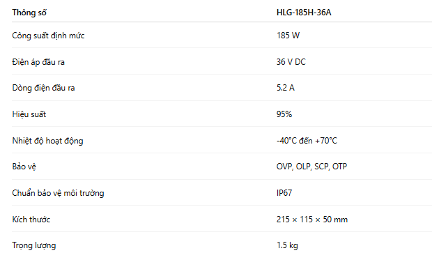 Độ bền cao cũng là điểm mạnh đáng chú ý. Vỏ nhôm đúc chắc chắn kết hợp với chuẩn chống nước và chống bụi IP67, cùng khả năng chịu nhiệt từ -40°C đến +70°C, giúp HLG-185H-36A vận hành ổn định trong môi trường khắc nghiệt, chịu được rung động, va đập và các yếu tố thời tiết bất lợi, từ mưa, nắng, bụi bẩn đến hóa chất trong công nghiệp.