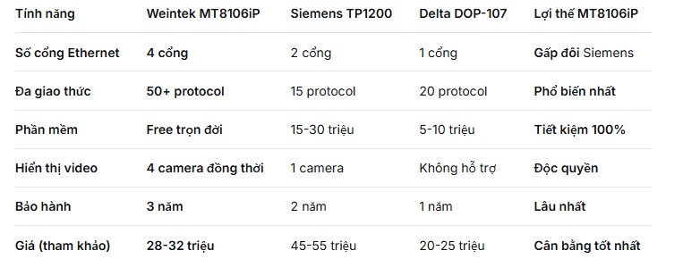Nhờ khả năng giao tiếp đa dạng với nhiều dòng PLC và thiết bị điều khiển phổ biến, MT8106iP đóng vai trò như cầu nối trung tâm, giúp thống nhất việc giám sát, điều khiển và thu thập dữ liệu trong toàn bộ hệ thống. Điều này đặc biệt quan trọng đối với các nhà máy đang từng bước chuẩn hóa và nâng cấp hệ thống tự động hóa.