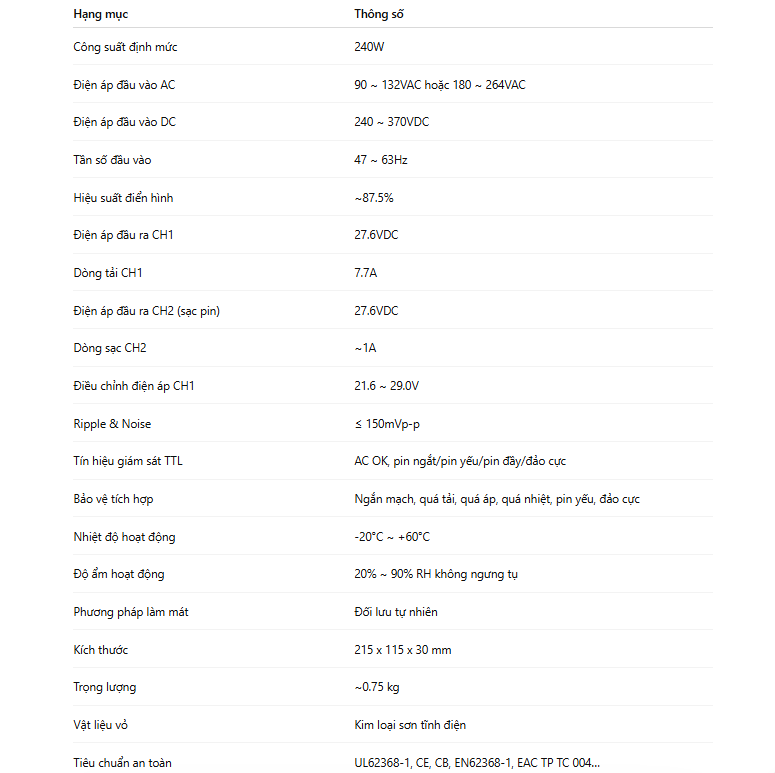 Cơ chế chuyển mạch tự động giữa nguồn AC và ắc quy được thực hiện nội bộ với độ trễ rất thấp, đảm bảo không gây sụt áp đáng kể trên đầu ra. Đây là yếu tố quan trọng đối với các hệ thống điều khiển, báo cháy hoặc an ninh, nơi bất kỳ gián đoạn nguồn nào cũng có thể ảnh hưởng trực tiếp đến an toàn và vận hành hệ thống.