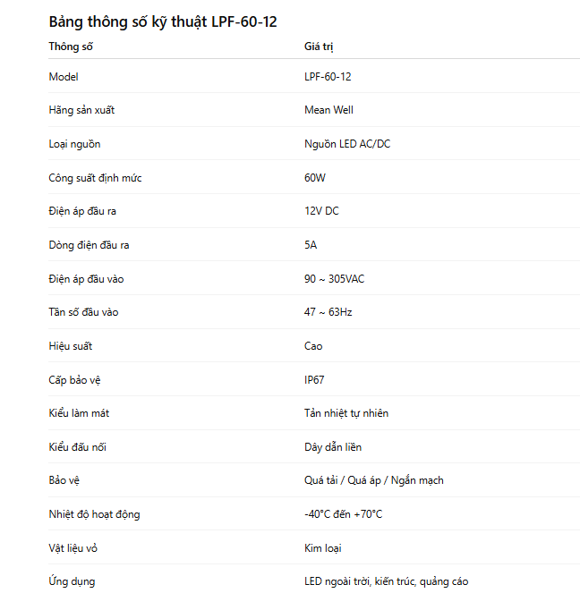 LPF-60-12 là bộ nguồn LED AC/DC công suất 60W, điện áp đầu ra 12VDC, thuộc dòng LPF của Mean Well – dòng nguồn được thiết kế chuyên dụng cho các hệ thống chiếu sáng LED trong nhà và ngoài trời. Với thiết kế kín hoàn toàn, khả năng chống nước và chống bụi cao, LPF-60-12 đáp ứng tốt các yêu cầu vận hành trong môi trường khắc nghiệt như ngoài trời, khu vực ẩm ướt hoặc nơi có nhiều bụi.