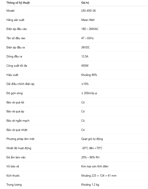 Nhờ sự kết hợp giữa công suất mạnh, điện áp ổn định, hiệu suất cao, hệ thống bảo vệ toàn diện và thiết kế bền bỉ, LRS-450-36 trở thành giải pháp cấp nguồn đáng tin cậy cho các hệ thống công nghiệp, tự động hóa và thiết bị công suất lớn.