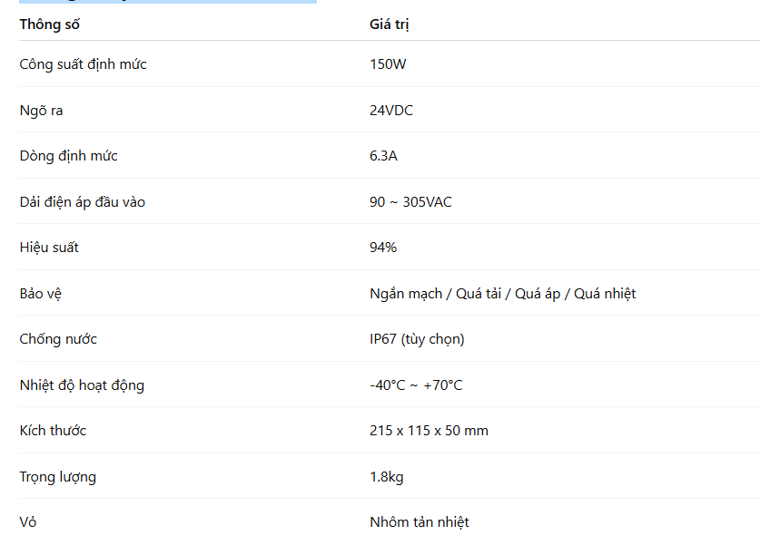 Nhờ các tính năng này, HLG-150H-24 đảm bảo nguồn điện ổn định và an toàn, giảm tối đa rủi ro cho hệ thống.