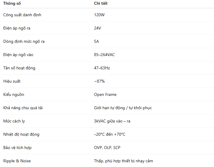 Ngoài ra, hiệu suất vận hành cao (~87%) giúp giảm hao phí điện năng và nhiệt sinh ra, mang lại hiệu quả năng lượng tối ưu, đồng thời phù hợp với các ứng dụng công nghiệp, phòng thí nghiệm, tủ điện, LED và các thiết bị IoT nhạy cảm. Bộ nguồn cũng hỗ trợ triển khai linh hoạt, dễ dàng lắp đặt trong tủ điện, hệ thống nhúng hoặc các dây chuyền tự động hóa mà không chiếm nhiều không gian.