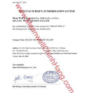 Gia Lực Tech là đại lý ủy quyền chính thức của Mean Well tại Việt Nam đến năm 2026, chuyên cung cấp nguồn điện công nghiệp chính hãng với đầy đủ CO, CQ. Với đội ngũ kỹ sư kỹ thuật giàu kinh nghiệm, Gia Lực Tech không chỉ bán hàng mà còn tư vấn, hỗ trợ kỹ thuật tận nơi. Cam kết hàng chính hãng 100%, giá cạnh tranh, giao nhanh toàn quốc. Các dòng sản phẩm phân phối gồm: LRS, RSP, MDR, NDR, HLG, NPB, NCP… và nhiều model hot trend khác. Gia Lực Tech – giải pháp nguồn điện đáng tin cậy cho nhà máy, tủ điện, LED và tự động hóa.
