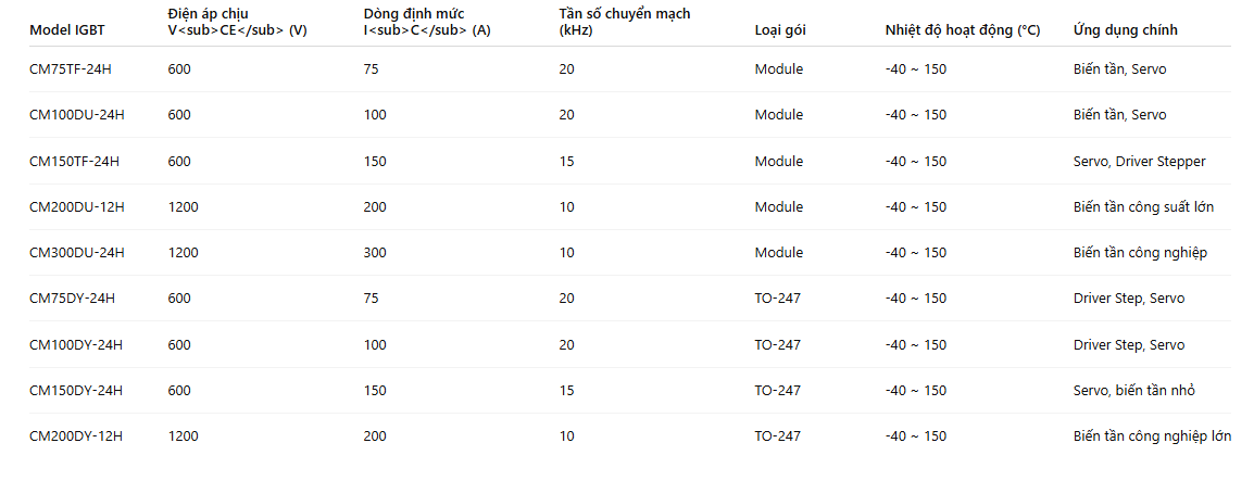 Khi lựa chọn IGBT cho ứng dụng Step, Servo hoặc biến tần, kỹ sư cần cân nhắc các thông số sau: