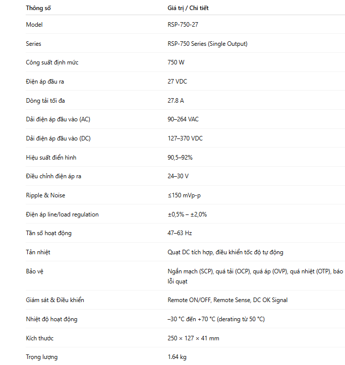 Tóm lại, MEAN WELL RSP‑750‑27 là lựa chọn đáng tin cậy cho những hệ thống công nghiệp cần nguồn DC mạnh mẽ, hiệu suất cao, bảo vệ toàn diện và khả năng giám sát thông minh. Thiết bị không chỉ giúp duy trì hoạt động liên tục và ổn định của hệ thống mà còn tiết kiệm chi phí vận hành và bảo trì nhờ tuổi thọ cao, khả năng chịu tải lớn và tích hợp nhiều tính năng hiện đại. Đây chính là lý do tại sao MEAN WELL RSP‑750‑27 luôn được ưu tiên sử dụng trong các môi trường công nghiệp khắt khe và các ứng dụng đòi hỏi chất lượng nguồn tuyệt đối.