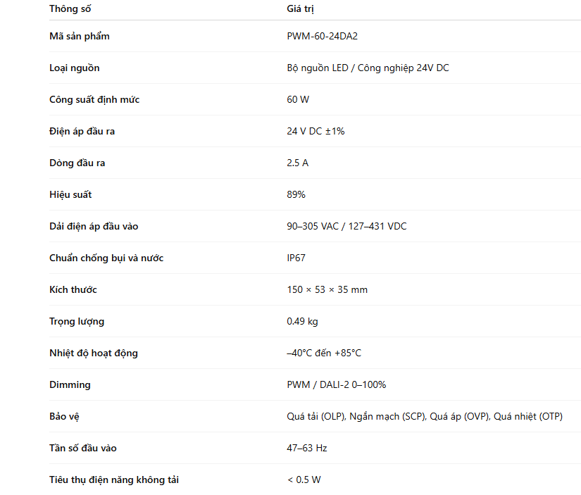 PWM-60-24DA2 là bộ nguồn chuyên dụng cho điều khiển động cơ DC, thuộc dòng PWM series của Mean Well. Sản phẩm tích hợp khả năng điều khiển tốc độ và mô-men xoắn động cơ thông qua tín hiệu PWM, phù hợp cho các ứng dụng tự động hóa yêu cầu điều khiển chính xác.