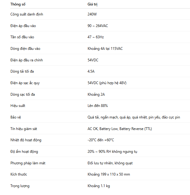 Sự kết hợp giữa hiệu suất chuyển đổi cao, khả năng chuyển mạch tự động giữa nguồn lưới và ắc quy, cùng hệ thống bảo vệ đa lớp giúp thiết bị đáp ứng các yêu cầu kỹ thuật nghiêm ngặt trong môi trường công nghiệp và viễn thông. Thiết kế không quạt làm mát giúp tăng độ bền dài hạn, giảm tiếng ồn và hạn chế bảo trì định kỳ.