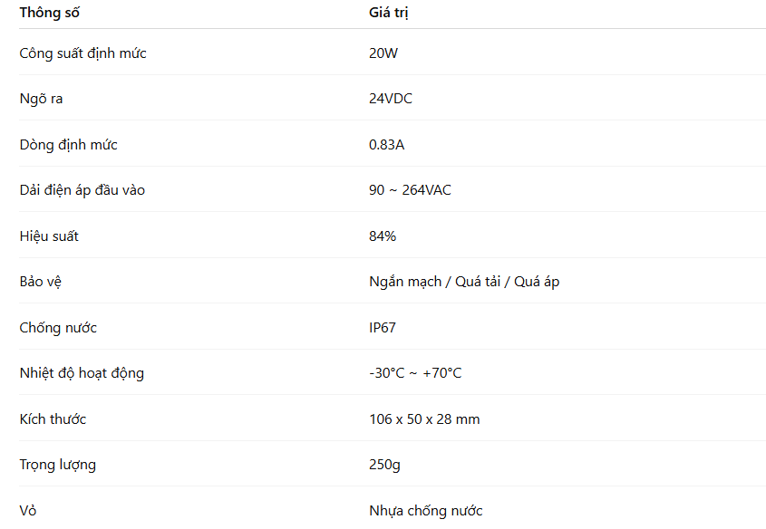 Với nguồn ra 24VDC và dòng 0.83A, bộ nguồn này đảm bảo ổn định điện áp, không nhấp nháy, phù hợp với các thiết bị cần vận hành liên tục và an toàn, từ hệ thống chiếu sáng LED đến camera giám sát và cảm biến IoT.