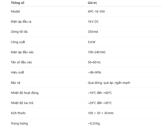 APC-16-350 là bộ nguồn LED công suất 5.6W thuộc dòng APC series của Mean Well, được thiết kế chuyên dụng cho các ứng dụng chiếu sáng LED với dòng điện không đổi (constant current), đảm bảo tuổi thọ và độ ổn định cho đèn LED.
