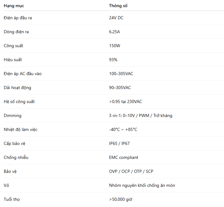 ELG-150-24B là bộ nguồn LED công suất 150W thuộc dòng ELG series cao cấp của Mean Well, được thiết kế cho các ứng dụng chiếu sáng LED chuyên nghiệp với khả năng điều chỉnh độ sáng linh hoạt và hiệu suất năng lượng tối ưu.
