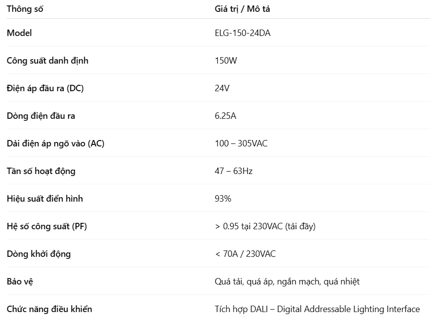 Nếu bạn đang tìm kiếm một giải pháp nguồn LED bền bỉ, an toàn, tiết kiệm năng lượng và sẵn sàng cho tương lai chiếu sáng thông minh, ELG-150-24DA chính là lựa chọn xứng đáng.