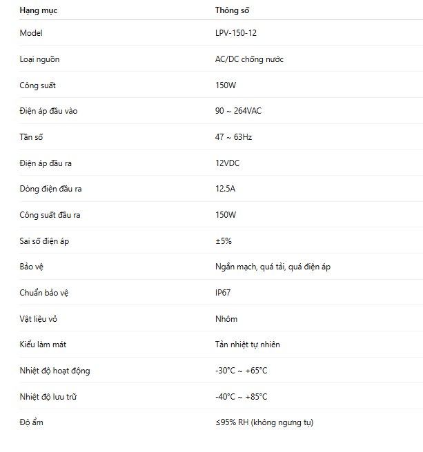 LPV-150-12 cung cấp điện áp đầu ra danh định 12VDC, với dòng điện tối đa lên tới 12.5A, tương ứng công suất đầu ra 150W. Đây là mức công suất lý tưởng cho các hệ thống DC 12V yêu cầu dòng lớn và hoạt động liên tục, đặc biệt là các ứng dụng LED và thiết bị ngoài trời.