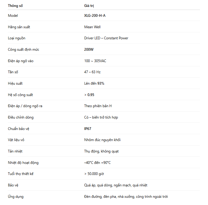 Với sự kết hợp hài hòa giữa hiệu suất, độ bền và độ an toàn, XLG-200-H-A là lựa chọn lý tưởng cho mọi dự án chiếu sáng yêu cầu chất lượng cao, tính ổn định lâu dài và hiệu quả đầu tư bền vững.