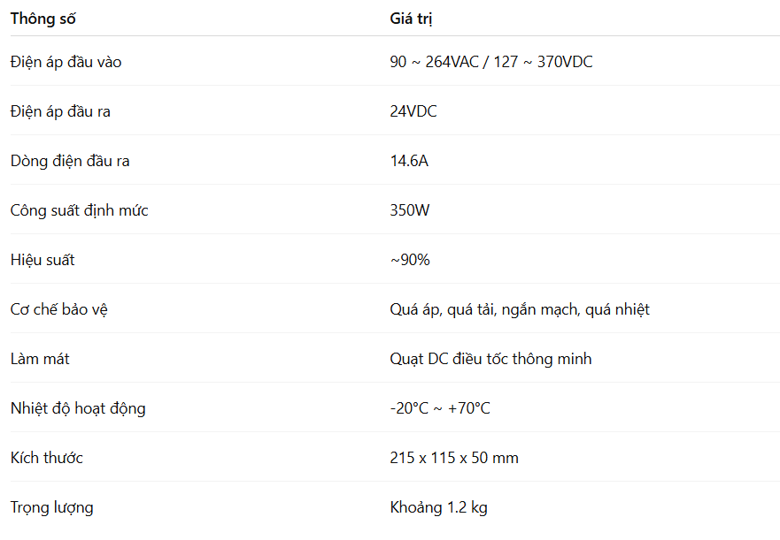 Với những ưu điểm trên, ERP-350-24 không chỉ là một bộ nguồn, mà còn là giải pháp bền vững cho mọi công trình và hệ thống công nghiệp.