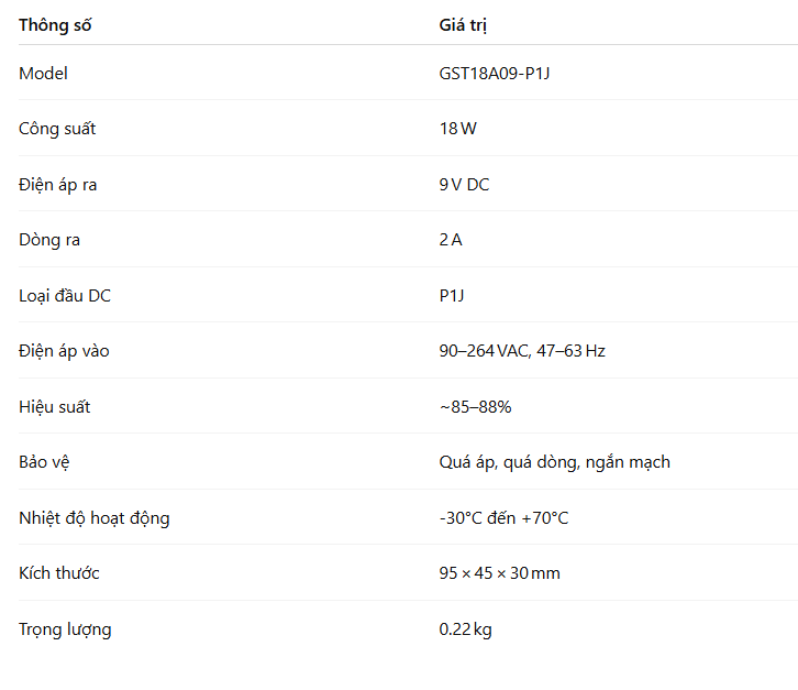 Nhờ những ưu điểm nổi bật này, GST18A09‑P1J không chỉ là một bộ nguồn thông thường mà còn là giải pháp toàn diện, đáng tin cậy và linh hoạt, phù hợp cho các dự án công nghiệp, hệ thống IoT hay các thiết bị văn phòng, đem lại hiệu quả cao và sự an tâm cho mọi kỹ sư và nhà thiết kế hệ thống.