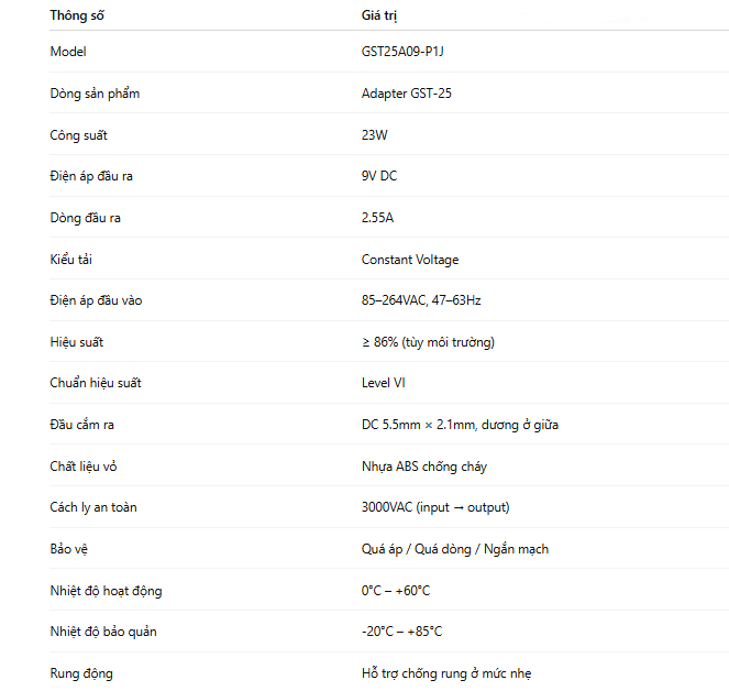 Khả năng chống nhiễu của adapter cũng là một điểm mạnh. Khi hoạt động, mọi bộ nguồn switching đều sinh ra nhiễu cao tần, nhưng GST25A09-P1J được trang bị mạch lọc nhiễu và bộ EMI được thiết kế đúng tiêu chuẩn quốc tế. Nhờ vậy, nguồn không chỉ làm sạch tín hiệu cấp cho thiết bị mà còn hạn chế tối đa việc tạo ra nhiễu ảnh hưởng đến thiết bị xung quanh. Điều này rất cần thiết trong môi trường có router, PLC, camera hoặc các thiết bị điện tử công suất nhỏ đặt gần nhau.