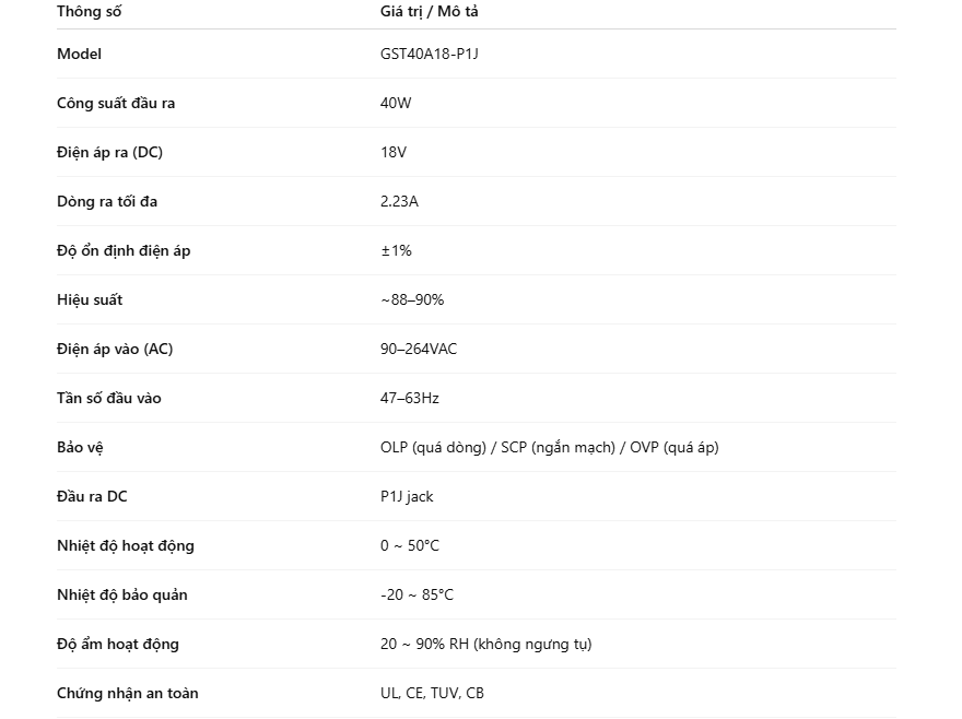 GST40A18-P1J là bộ nguồn công suất 40W thuộc dòng GST series của Mean Well, được thiết kế cho các ứng dụng công nghiệp với vỏ kim loại kín, đáp ứng tiêu chuẩn bảo vệ IP64, phù hợp cho môi trường có bụi và hơi ẩm.