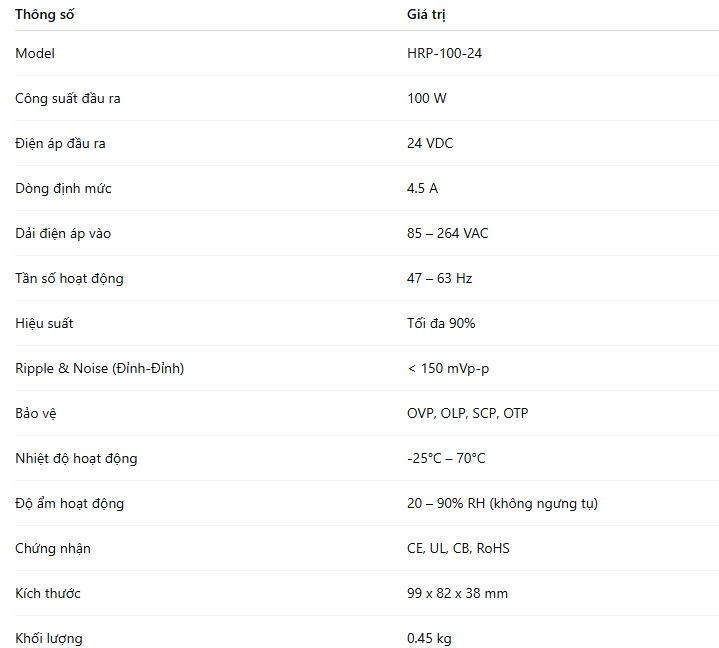 Nhờ thiết kế chuẩn mực này, HRP-100-24 không chỉ đơn thuần là một bộ nguồn 100W, mà là một thiết bị điện tử công nghiệp được tính toán kỹ lưỡng để “sống tốt” trong môi trường mà nhiều loại nguồn khác thường xuyên gặp sự cố.