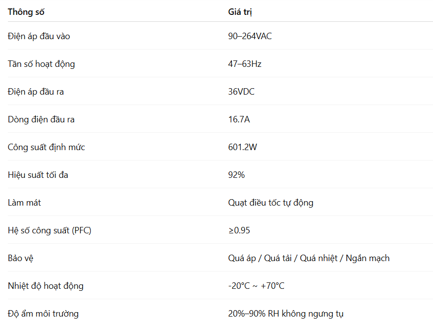 ✔ Điện áp ra: 36VDC (32.4~39.6V điều chỉnh)
