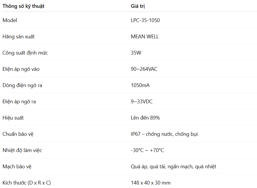 Ngoài ra, LPC-35-1050 cũng được nhiều kỹ sư lựa chọn trong các hệ thống chiếu sáng công nghiệp, nhà xưởng, dây chuyền sản xuất, nơi yêu cầu nguồn điện ổn định và tuổi thọ vận hành dài.