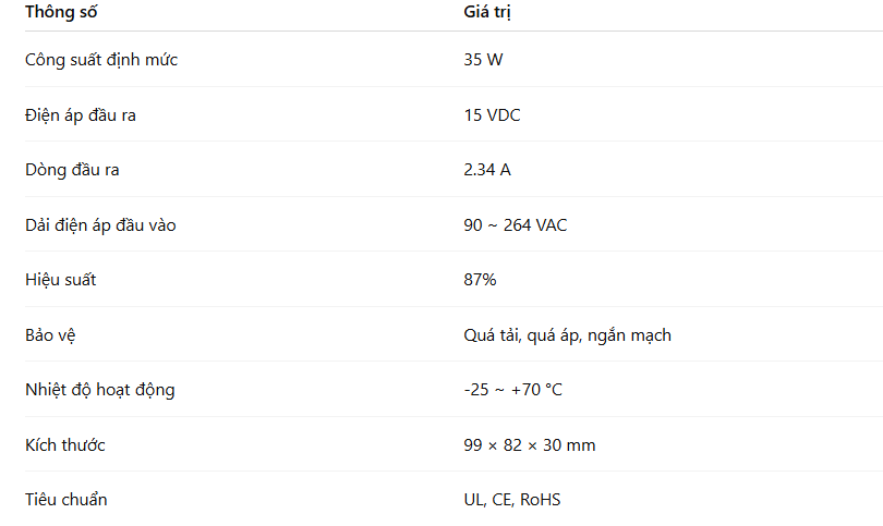 MEAN WELL LPV-35-15 ra đời để đáp ứng nhu cầu đó, cung cấp 35 W công suất liên tục với đầu ra 15 V DC, tối ưu cho nhiều ứng dụng từ tự động hóa công nghiệp, chiếu sáng LED, thiết bị nhúng, đến các thiết bị an ninh và y tế.