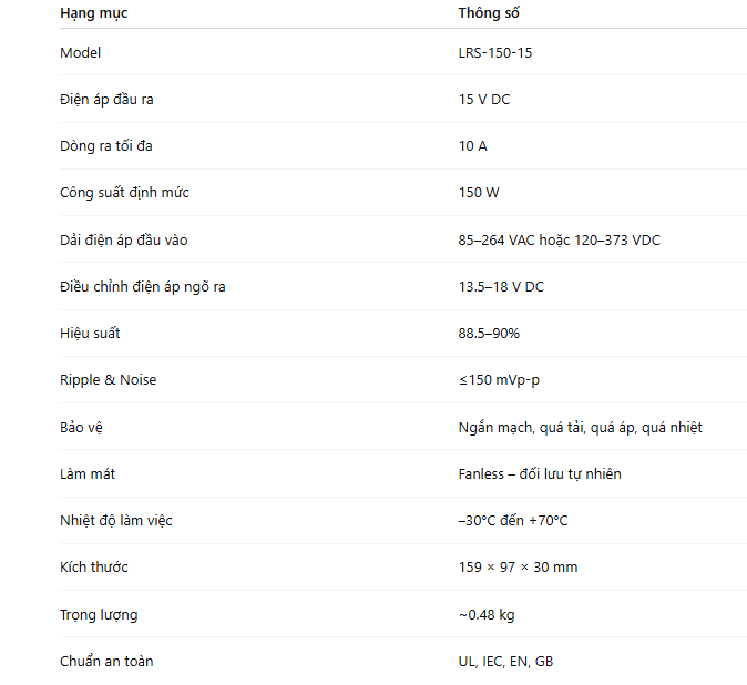 Nhờ những ưu điểm vượt trội này, LRS‑150‑15 không chỉ là nguồn điện AC-DC chất lượng cao mà còn là giải pháp chiến lược giúp các doanh nghiệp tối ưu hóa vận hành, giảm rủi ro và nâng cao hiệu suất tổng thể cho các dự án công nghiệp hiện đại.