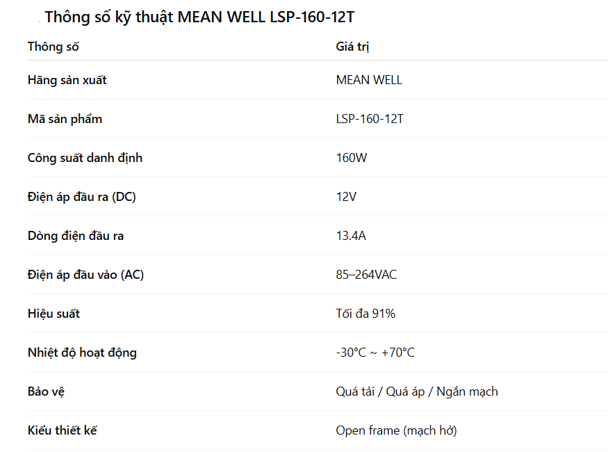 Hiệu suất chuyển đổi vượt trội: Với hiệu suất lên tới 91%, LSP-160-12T giúp giảm tổn thất năng lượng, hạn chế nhiệt tỏa ra và tối ưu hóa chi phí vận hành, đồng thời nâng cao tuổi thọ thiết bị.