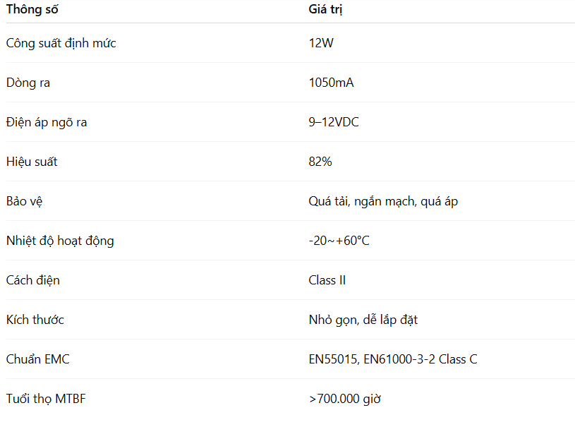 Với khả năng hoạt động liên tục trong dải nhiệt độ từ -20°C đến +60°C, bộ nguồn này đáp ứng tốt các điều kiện khắc nghiệt, giữ cho đèn LED sáng ổn định trong thời gian dài, duy trì hiệu suất tối ưu và đảm bảo độ bền cho toàn bộ hệ thống.