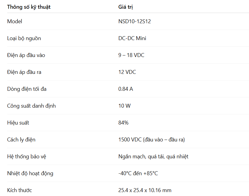 Nhờ những lợi ích này, NSD10-12S12 trở thành lựa chọn lý tưởng cho các kỹ sư, nhà tích hợp hệ thống và các dự án yêu cầu nguồn DC-DC đáng tin cậy.